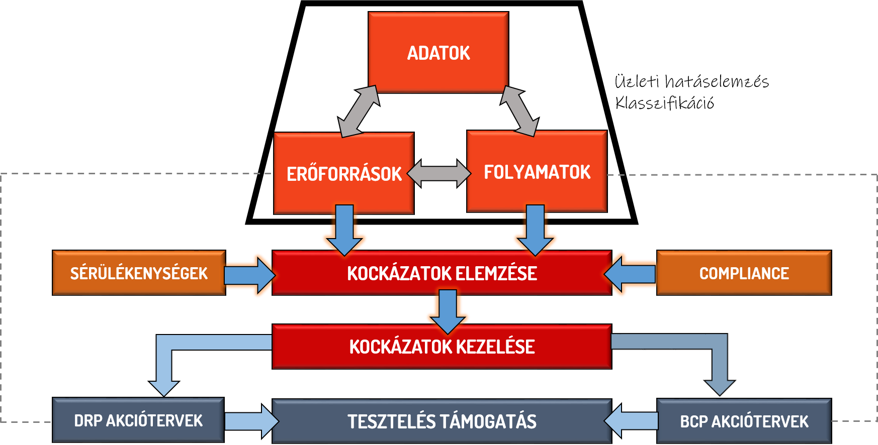 Üzleti hatáselemzés (Business Impact Analysis – BIA) készítése, kritikus folyamatok és támogató erőforrások azonosítása az egyes felmérésekhez kapcsolódóan.