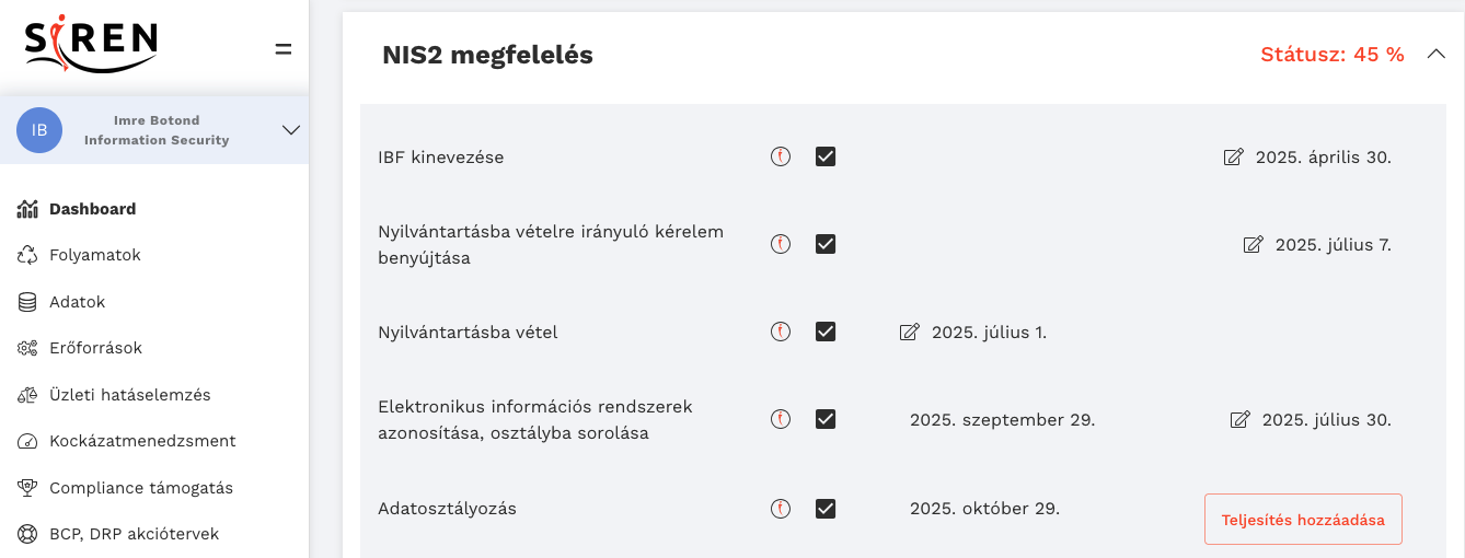 A NIS2 dashboard kiegészítő jelenleg automatikusan megjelenik minden érintett szervezetnél, és lehetőséget ad a feladatok nyomon követésére. A megfeleléshez kapcsolódó egyéb rendszerbeli feladatok, mint például az EIR-ek azonosítása, besorolása, valamit az OVI táblák kitöltésének statisztikái szintén automatikusan jelennek meg a felületen.